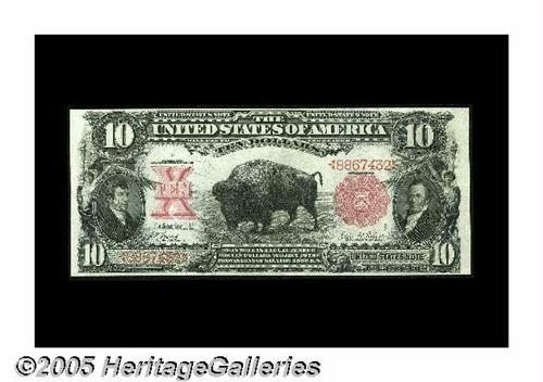 <B>Fr. 114 $10 1901 Legal Tender Extremely Fine-About Uncirculated.</B></I> A couple of light folds are found on this enticing Bison that comes from the first Friedberg number for this design. This design was originally chosen to commemorate the 100th anniversary of the Corps of Discovery.