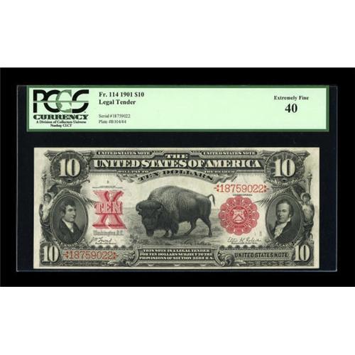 <B>Fr. 114 $10 1901 Legal Tender PCGS Extremely Fine 40.</B></I> This pleasing Bison is well margined and nicely centered and it also has good color and plenty of eye appeal.<BR><BR><b>Shipping:</b> Coins & Currency (<a target="_blank" href="http://www.heritageauctions.com/common/shipping.php">view shipping information</a>)