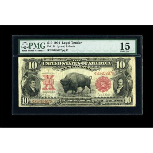 <B>Fr. 114 $10 1901 Legal Tender PMG Choice Fine 15.</B></I> Average circulation is noticed on this Bison.<BR><BR><b>Shipping:</b> Coins & Currency (<a target="_blank" href="http://www.heritageauctions.com/common/shipping.php">view shipping information</a>)