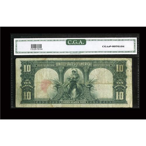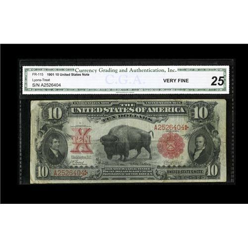 <B>Fr. 115 $10 1901 Legal Tender CGA Very Fine 25.</B></I> This moderately circulated issue features honest wear. A split in the right margin is noted, but it does not extend into the design.