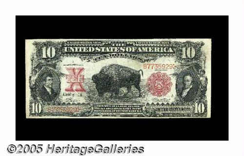 <B>Fr. 116 $10 1901 Legal Tender About Uncirculated.</B></I> Light handling and a touch of natural paper ripple define this scarcer Bison.