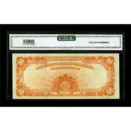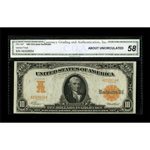 <B>Fr. 1167 $10 1907 Gold Certificate CGA About Uncirculated 58.</B></I> The inks are bright and the margins solid on this boldly overprinted Gold Certificate.<BR><BR><b>Shipping:</b> Coins & Currency (<a target="_blank" href="http://www.heritageauctions.com/common/shipping.php">view shipping information</a>)