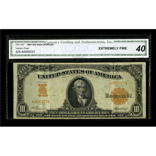 <B>Fr. 1167 $10 1907 Gold Certificate CGA Extremely Fine 40.</B></I> A pleasing well margined note, with good color, but with a few too many folds.<BR><BR><b>Shipping:</b> Coins & Currency (<a target="_blank" href="http://www.heritageauctions.com/common/shipping.php">view shipping information</a>)