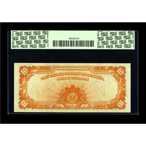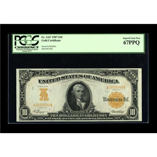 <B>Fr. 1167 $10 1907 Gold Certificate PCGS Superb Gem New 67PPQ.</B></I> This is the first time this Friedberg number is being listed in a Superb Gem holder with the PPQ suffix. In the census this note is listed as ex-Amon Carter. If what you seek is the best, you need look no further as this note has pomp and pedigree. A note that stands head and shoulders above many of its census mates.<BR><BR><b>Shipping:</b> Coin/Currency (<a target="_blank" href="http://www.heritageauctions.com/common/shipping.php">view shipping information</a>)