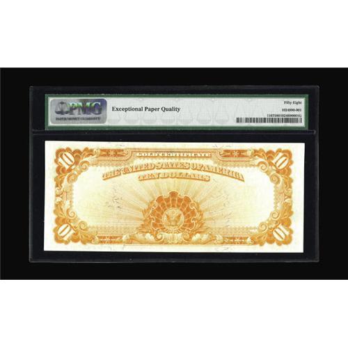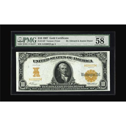 <B>Fr. 1167 $10 1907 Gold Certificate PMG Choice About Unc 58 EPQ.</B></I> This basic design was used for the only two series of Ten Dollar Gold Certificates. Only very minor changes were made to the face in the the switch from the 1907 series to the 1922, and both notes share the identical back design. This piece gives the appearance of a perfect Gem, though as a technical AU note, it should prove to be quite affordable. According to the Dauer book, Michael Hillegas, whose portrait appears on this note, "...was a good friend of Ben Franklin... He is buried next to Franklin in Philadelphia, near the Liberty Bell and Independence Hall." This note appears on page 292 of American History as Seen Through Currency.<BR><I>From The Dr. Edward and Joanne Dauer Collection</B></I>