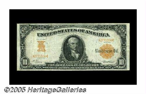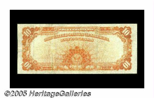 <B>Fr. 1167 $10 1907 Gold Certificate Very Fine.</B></I> Hugely margined and crackling-fresh, with excellent color for the grade. A surprisingly difficult number, with fewer than 70 examples known in all grades combined.