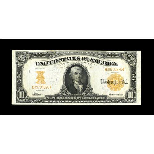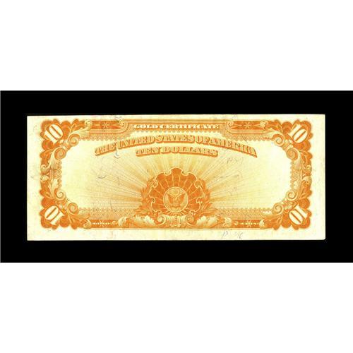 <B>Fr. 1169 $10 1907 Gold Certificate Very Fine-Extremely Fine.</B></I> Though a trifle flat, the folds that account for the grade were minimized over time. The front to back centering is a little off, though the margins are still sufficient.<BR><BR><b>Shipping:</b> Coin/Currency (<a target="_blank" href="http://www.heritageauctions.com/common/shipping.php">view shipping information</a>)