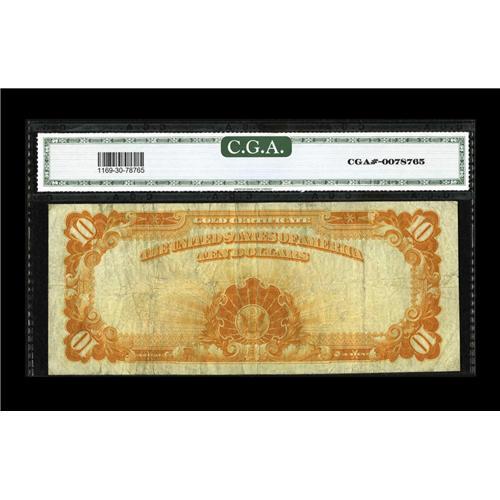 <B>Fr. 1169a $10 1907 Gold Certificate CGA Very Fine 30.</B></I> Vivid colors remain on this mid-grade Gold Certificate.