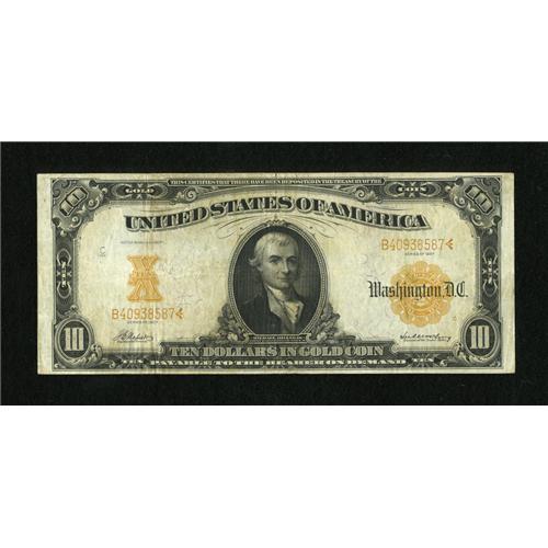 <B>Fr. 1169a $10 1907 Gold Certificate Very Fine.</B></I> A total of only 61 examples of this issue have been reported by collectors. This piece is in the middle for quality and frankly, is a pleasing VF.<BR><I>From The Collection of Greg Southward</B></I><BR><BR><b>Shipping:</b> Coins & Currency (<a target="_blank" href="http://www.heritageauctions.com/common/shipping.php">view shipping information</a>)