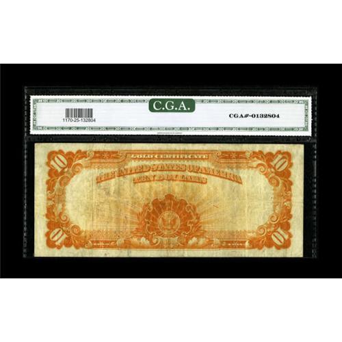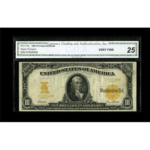 <B>Fr. 1170a $10 1907 Gold Certificate CGA Very Fine 25.</B></I> The golden-orange tones of the overprint and back design remain bold on this moderately circulated piece. This remains a scarcer signature combination.<BR><BR><b>Shipping:</b> Coins & Currency (<a target="_blank" href="http://www.heritageauctions.com/common/shipping.php">view shipping information</a>)