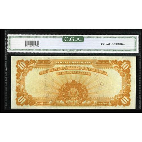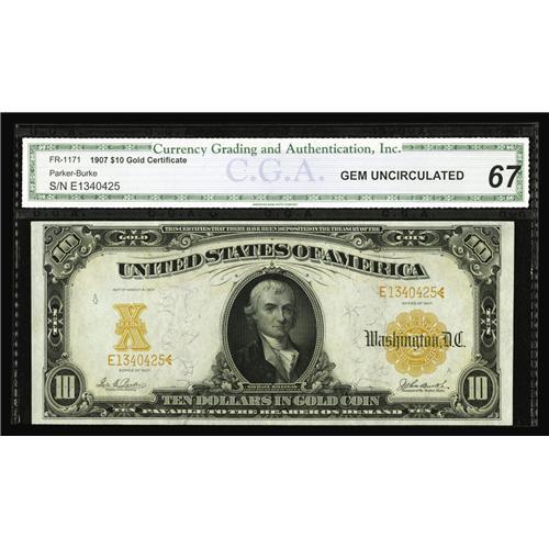 <B>Fr. 1171 $10 1907 Gold Certificate CGA Gem Uncirculated 67.</B></I> Not a particularly rare number in the lesser uncirculated grades, but examples with the color, print quality, and margins of this piece are very seldom encountered.