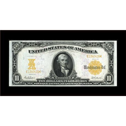 <B>Fr. 1171 $10 1907 Gold Certificate Choice About New.</B></I> A soft center bend is visible on natural paper surfaces. The color is simply amazing. Notes like this generally realize more than their processed cousins.<BR><BR><b>Shipping:</b> Coin/Currency (<a target="_blank" href="http://www.heritageauctions.com/common/shipping.php">view shipping information</a>)