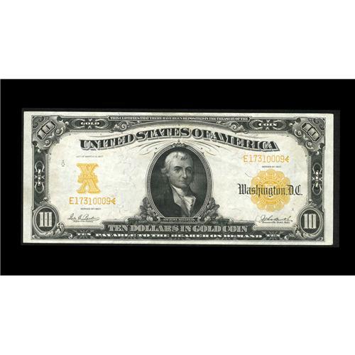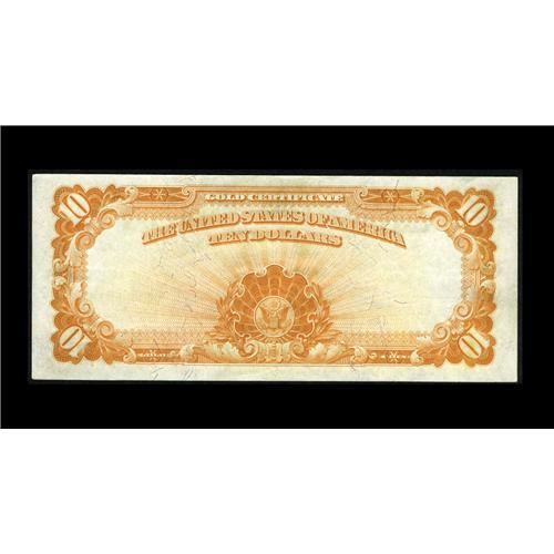 <B>Fr. 1171 $10 1907 Gold Certificate Choice Extremely Fine.</B></I> This is the type of XF that every collector wants. The original embossing is plainly in evidence, the colors are perfect, and the design is surrounded by huge margins on both sides. A premium example.