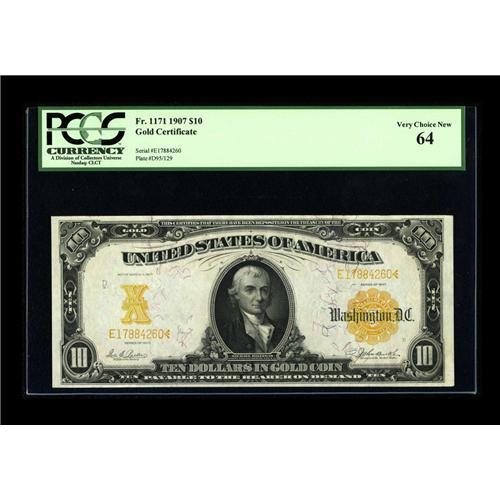 <B>Fr. 1171 $10 1907 Gold Certificate PCGS Very Choice New 64.</B></I> A real beauty, with huge margins, super print quality and ideal colors. A note that is sure to please.<BR><BR><b>Shipping:</b> Coins & Currency (<a target="_blank" href="http://www.heritageauctions.com/common/shipping.php">view shipping information</a>)