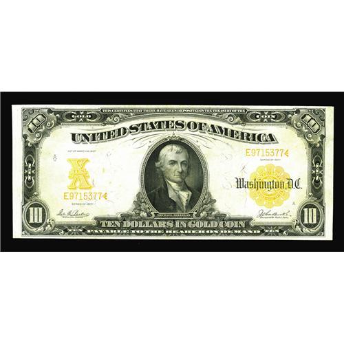 <B>Fr. 1171 $10 1907 Gold Certificate Very Fine-Extremely Fine.</B></I> This handsome $10 Gold with natural paper ripple was received from a teller and promptly folded into sixths with five vertical folds. A few small non-distracting light spots are also noticed during the examining process.
