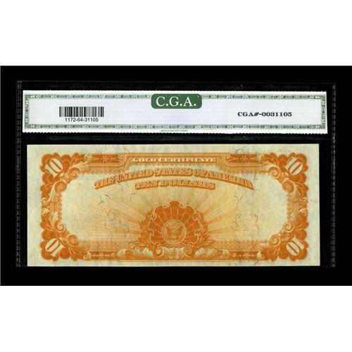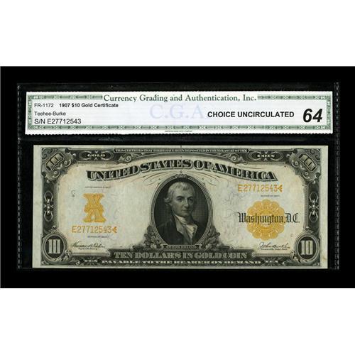 <B>Fr. 1172 $10 1907 Gold Certificate CGA Choice Uncirculated 64.</B></I> We first auctioned this note in September of 2002, when it was raw. At that time, we graded the note Very Choice New and described it as follows, "The back color on this pretty Gold Certificate is a deep, brilliant orange, and the eye appeal of the note is exceptional. This Hillegas Ten comes very close to the full Gem grade."<BR><BR><b>Shipping:</b> Coin/Currency (<a target="_blank" href="http://www.heritageauctions.com/common/shipping.php">view shipping information</a>)