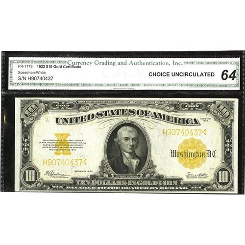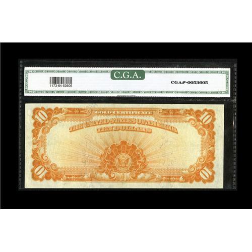 <B>Fr. 1173 $10 1922 Gold Certificate CGA Choice Uncirculated 64.</B></I> The surfaces do look very natural on this brightly colored Gold Note. The lower left margin is cut a bit thin thus keeping it from a higher grade.