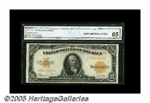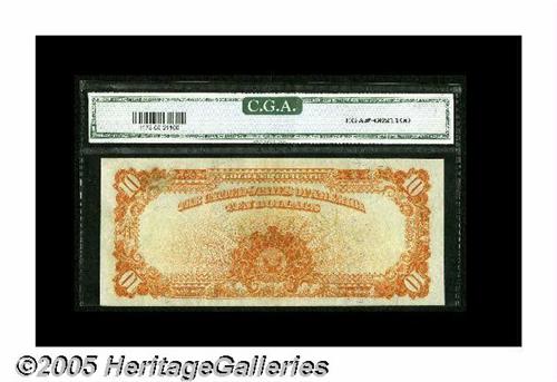 <B>Fr. 1173 $10 1922 Gold Certificate CGA Gem Uncirculated 65.</B></I> A bright, well-margined example of this always-popular type.