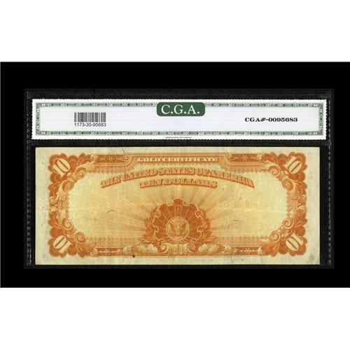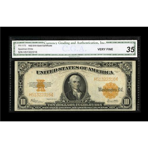 <B>Fr. 1173 $10 1922 Gold Certificate CGA Very Fine 35.</B></I> This is a colorful representative of a popular issue.