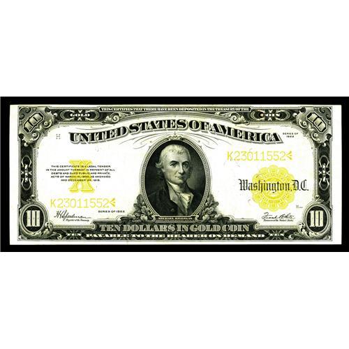 <B>Fr. 1173 $10 1922 Gold Certificate Choice New.</B></I> This attractive Gold Certificate boasts bold embossing and great color.
