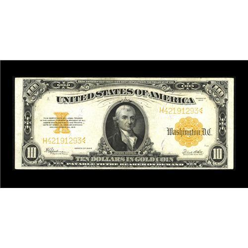 <B>Fr. 1173 $10 1922 Mule Gold Certificate Extremely Fine-About New.</B></I> There is a horizontal bend and some folds including one corner. The paper is original and attractive, though some soiling is noted on the back.<BR><I>From The Bill and Kathy Stella Currency Collection</B></I><BR><BR><b>Shipping:</b> Coin/Currency (<a target="_blank" href="http://www.heritageauctions.com/common/shipping.php">view shipping information</a>)