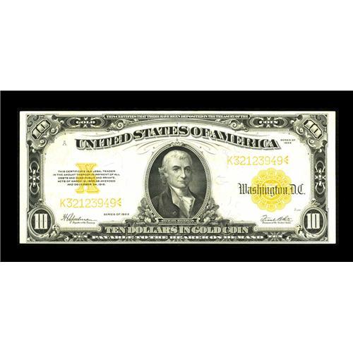 <B>Fr. 1173 $10 1922 Gold Certificate Extremely Fine.</B></I> This note clearly has all the right waves in all the right places. Embossing from the serial numbers and seal is readily apparent when viewing the note from the richly colored back.<BR><BR><b>Shipping:</b> Coin/Currency (<a target="_blank" href="http://www.heritageauctions.com/common/shipping.php">view shipping information</a>)