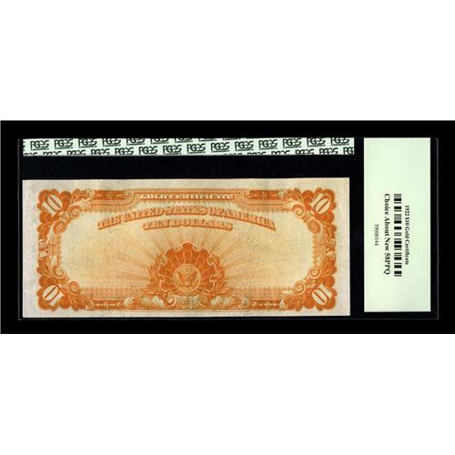 <B>Fr. 1173 $10 1922 Gold Certificate PCGS Choice About New 58PPQ.</B></I> Wonderful, eye popping embossing is visible on the brightly hued back. It looks like a light vertical fold at left has dropped this beauty from the Choice New grade.<BR><BR><b>Shipping:</b> Coin/Currency (<a target="_blank" href="http://www.heritageauctions.com/common/shipping.php">view shipping information</a>)
