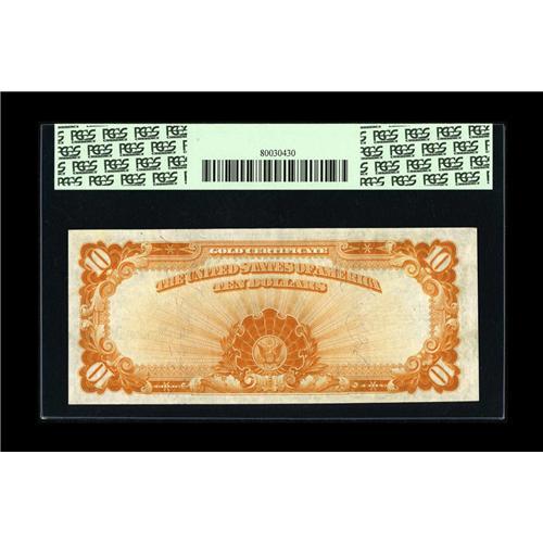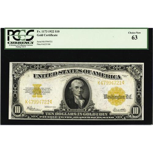 <B>Fr. 1173 $10 1922 Gold Certificate PCGS Choice New 63.</B></I> A beautiful, crisp, bright example that is well centered and has wonderful colors. Uncirculated Gold Certificates are scarce in all formats, but large size notes are extremely difficult to find in today's market. This note should command quite a premium.