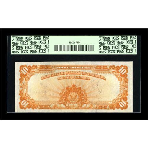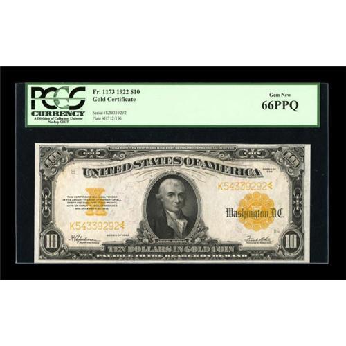 <B>Fr. 1173 $10 1922 Gold Certificate PCGS Gem New 66PPQ.</B></I> A common note, even in high grade, but this piece is outstanding. It has all the color, embossing and crispness that one would expect, but it also has huge margins at both the top and bottom, which is extremely unusual for this issue. Most all examples have broad side margins, as the presently offered piece does, but the longer margins are usually slim to nonexistent. A beautiful piece fit for the finest of collections. <BR><BR><b>Shipping:</b> Coins & Currency (<a target="_blank" href="http://www.heritageauctions.com/common/shipping.php">view shipping information</a>)