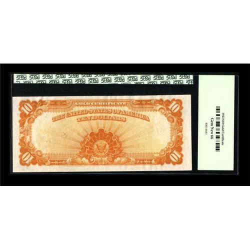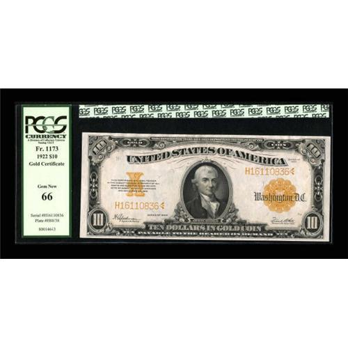 <B>Fr. 1173 $10 1922 Gold Certificate PCGS Gem New 66.</B></I> A lovely, well margined example that exhibits creamy white surfaces and strongly inked overprints. Seldom seen this nice.<BR><BR><b>Shipping:</b> Coins & Currency (<a target="_blank" href="http://www.heritageauctions.com/common/shipping.php">view shipping information</a>)