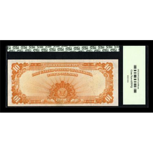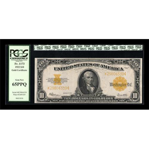 <B>Fr. 1173 $10 1922 Gold Certificate PCGS Gem New 65PPQ.</B></I> This is another gorgeous example that exhibits bright, vivid color and easily seen punch through embossing.<BR><BR><b>Shipping:</b> Coins & Currency (<a target="_blank" href="http://www.heritageauctions.com/common/shipping.php">view shipping information</a>)