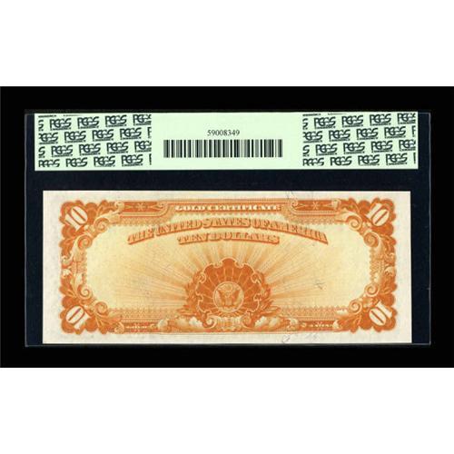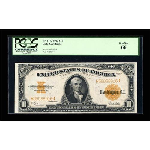 <B>Fr. 1173 $10 1922 Gold Certificate PCGS Gem New 66.</B></I> The margins are simply amazing for a 1922 Ten Dollar Gold. The color of the paper and inks are also one hundred percent fully bright. The note may well have as much eye appeal as any 1173 we've ever seen. We've seen quite a few. As the Track & Price census indicates, over 3000 pieces of this number are known. It seems to this cataloger that we've written up every one of them. Most, twice. This is one we would distinctly remember. Beautiful.<BR><I>From The Thomas M. Flynn Collection</B></I><BR><BR><b>Shipping:</b> Coins & Currency (<a target="_blank" href="http://www.heritageauctions.com/common/shipping.php">view shipping information</a>)
