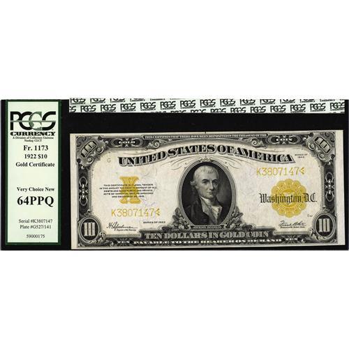 <B>Fr. 1173 $10 1922 Gold Certificate PCGS Very Choice New 64PPQ.</B></I> A little more margin at left and this bright, well embossed Hillegas issue would be a Gem.