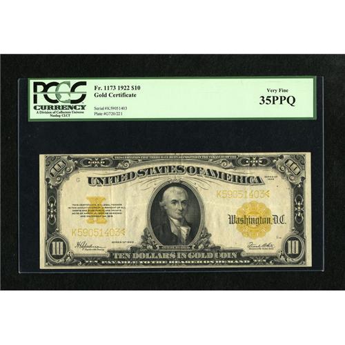 <B>Fr. 1173 $10 1922 Gold Certificate PCGS Very Fine 35PPQ.</B></I> Pleasing color remains on surfaces with much crispness and embossing visible.<BR><BR><b>Shipping:</b> Coins & Currency (<a target="_blank" href="http://www.heritageauctions.com/common/shipping.php">view shipping information</a>)