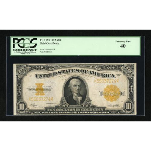<B>Fr. 1173 $10 1922 Gold Certificate PCGS Extremely Fine 40.</B></I> This three fold issue boasts a bright overprint and boldly colored back.<BR><BR><b>Shipping:</b> Coins & Currency (<a target="_blank" href="http://www.heritageauctions.com/common/shipping.php">view shipping information</a>)