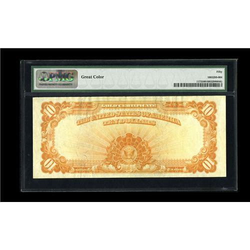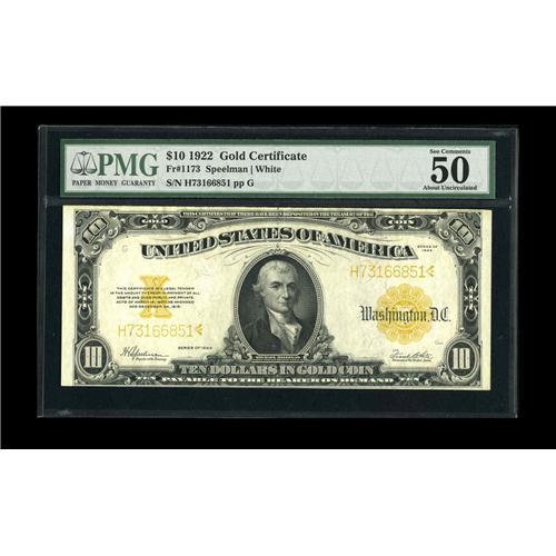 <B>Fr. 1173 $10 1922 Gold Certificate PMG About Uncirculated 50.</B></I> PMG comments: "Great Color"...we don't know why since it looks faded to us.