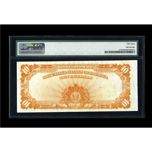<B>Fr. 1173 $10 1922 Gold Certificate PMG Choice About Unc 58.</B></I> A pleasing Gold Seal that is very bright. The bottom margin is almost cut into the bottom frameline.