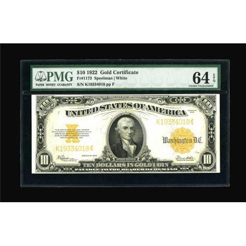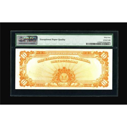 <B>Fr. 1173 $10 1922 Gold Certificate PMG Choice Uncirculated 64 EPQ.</B></I> Deeply colored overprints add to the enormous eye appeal of this wonderfully embossed near Gem.<B><BR></B></I><I>From The John Ameen Collection<BR></B></I><BR><BR><b>Shipping:</b> Coins & Currency (<a target="_blank" href="http://www.heritageauctions.com/common/shipping.php">view shipping information</a>)