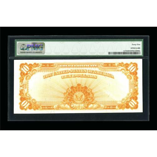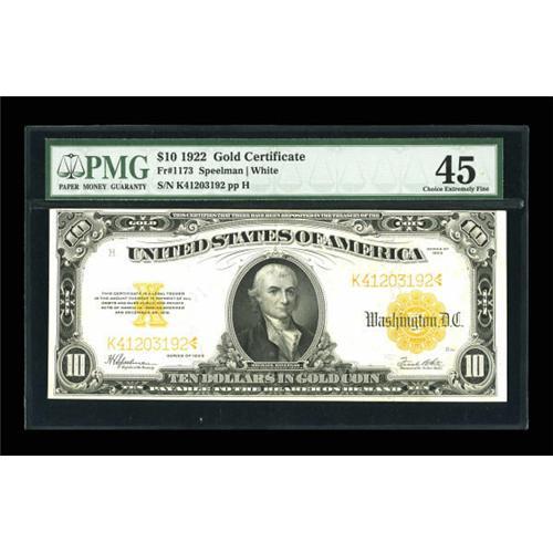<B>Fr. 1173 $10 1922 Gold Certificate PMG Choice Extremely Fine 45.</B></I> Light handling is noticed on this colorful representative example.<BR><BR><b>Shipping:</b> Coins & Currency (<a target="_blank" href="http://www.heritageauctions.com/common/shipping.php">view shipping information</a>)