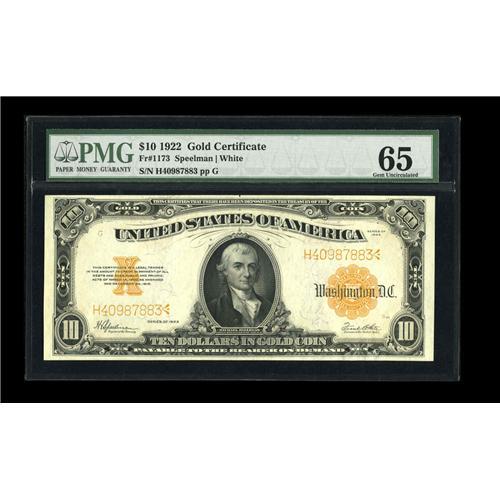 <B>Fr. 1173 $10 1922 Gold Certificate PMG Gem Uncirculated 65.</B></I> A nicely margined example.
