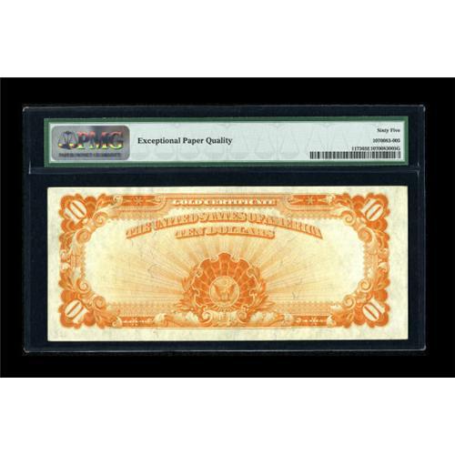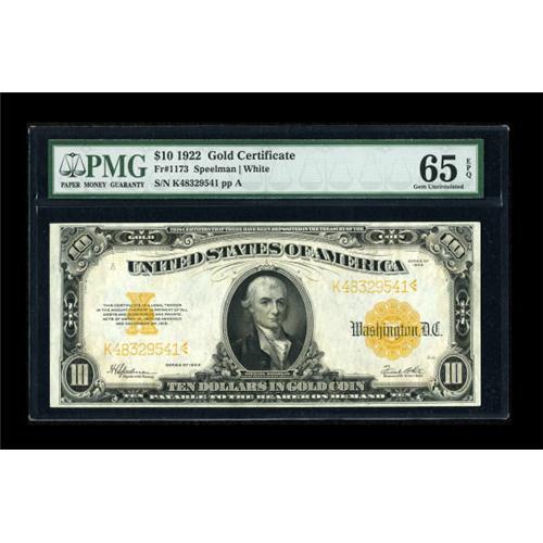<B>Fr. 1173 $10 1922 Gold Certificate PMG Gem Uncirculated 65 EPQ.</B></I> It has been some time since we have been able to offer a new, original example of this popular issue. Bright inks and pleasing embossing are noticed.<BR><BR><b>Shipping:</b> Coins & Currency (<a target="_blank" href="http://www.heritageauctions.com/common/shipping.php">view shipping information</a>)