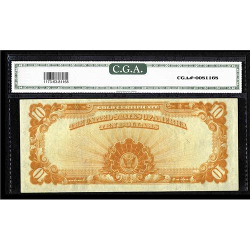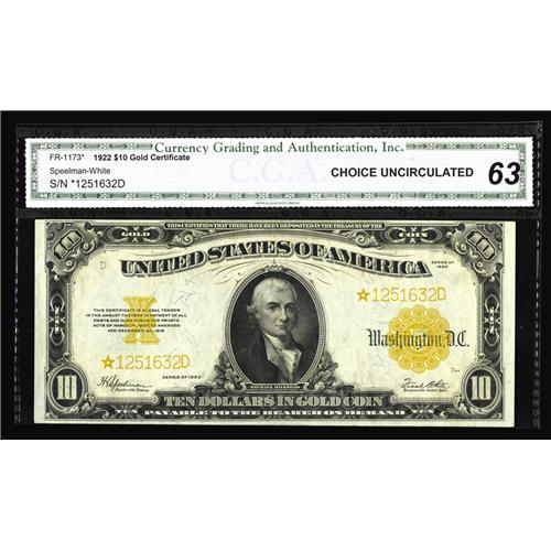 <B>Fr. 1173 $10 1922 Gold Certificate Star CGA Choice Uncirculated 63.</B></I> While hardly scarce in lower grades, large Gold Certificate stars are quite scarce in this state of preservation. With a broader top margin, this piece would likely have been graded considerably higher.