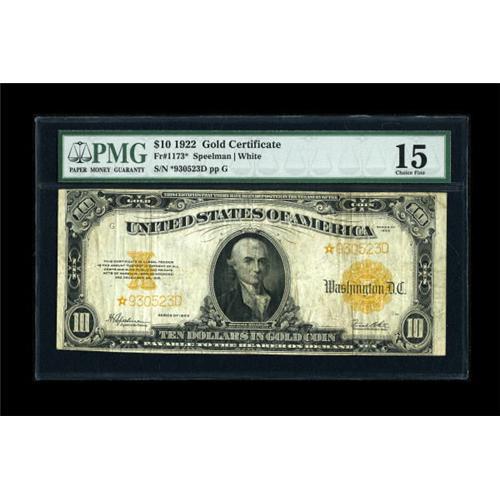 <B>Fr. 1173 $10 1922 Gold Certificate Star Note PMG Choice Fine 15.</B></I> Gold seal replacement notes are alluring. This example has strong margins and bright surfaces.<BR><BR><b>Shipping:</b> Coins & Currency (<a target="_blank" href="http://www.heritageauctions.com/common/shipping.php">view shipping information</a>)