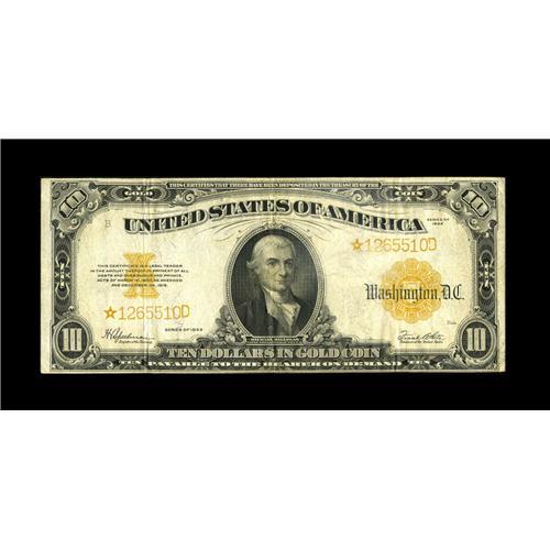 <B>Fr. 1173 $10 1922 Gold Certificate Star Note Very Fine.</B></I> A bit of removed ink is noticed to the right of the portrait area on this example which has not been recognized in census data.<BR><BR><b>Shipping:</b> Coin/Currency (<a target="_blank" href="http://www.heritageauctions.com/common/shipping.php">view shipping information</a>)