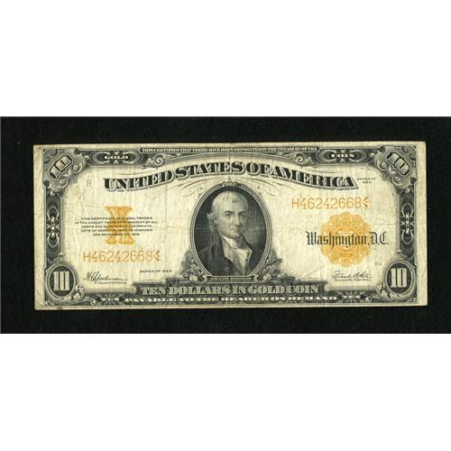 <B>Fr. 1173 $10 1922 Gold Certificate Very Fine.</B></I> All of the printed details remain bright and the note is attractive.<BR><BR><b>Shipping:</b> Coins & Currency (<a target="_blank" href="http://www.heritageauctions.com/common/shipping.php">view shipping information</a>)