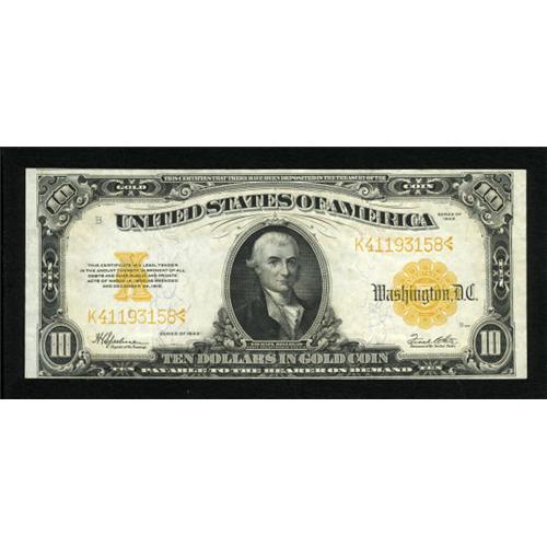 <B>Fr. 1173 $10 1922 Gold Certificate Very Fine+.</B></I> This is an attractive upper mid-grade $10 Gold. It has original paper surfaces and nice orange ink.<BR><BR><b>Shipping:</b> Coins & Currency (<a target="_blank" href="http://www.heritageauctions.com/common/shipping.php">view shipping information</a>)