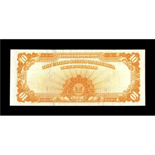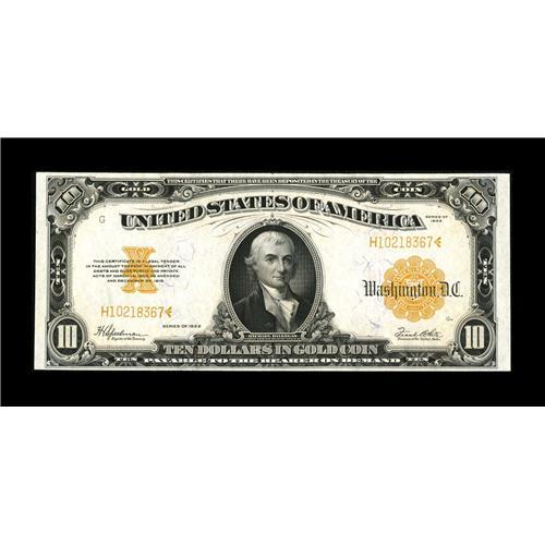 <B>Fr. 1173a $10 1922 Gold Certificate Choice About New.</B></I> The small serial numbers are 4mm as compared to 5mm for the large serial numbers. The ratio in the census is about eight to one in favor of the large serial number notes. This one has the appearance of a Gem New note with beautiful color and excellent centering. There is a single fold about an inch and a half in from the left edge. This type has historically been, and in our opinion remains, undervalued.<BR><BR><b>Shipping:</b> Coin/Currency (<a target="_blank" href="http://www.heritageauctions.com/common/shipping.php">view shipping information</a>)