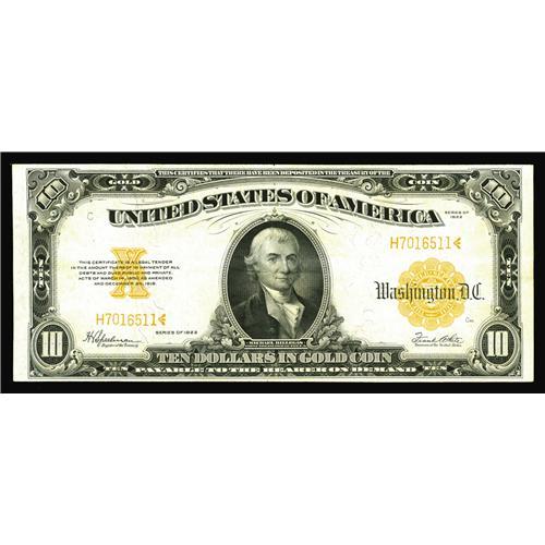 <B>Fr. 1173a $10 1922 Gold Certificate Very Fine.</B></I> Nice inks and bright paper are just two of the characteristics of this $10 Gold from the scarcer small serial number persuasion. The small serial numbers are 4mm as compared to 5mm for the large serial numbers. The ratio in the census is about eight to one in favor of the large serial number notes.