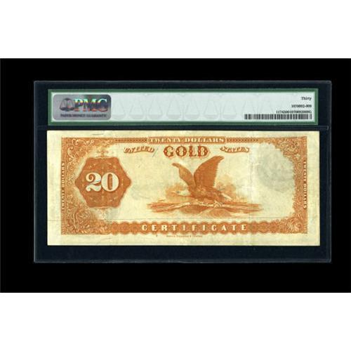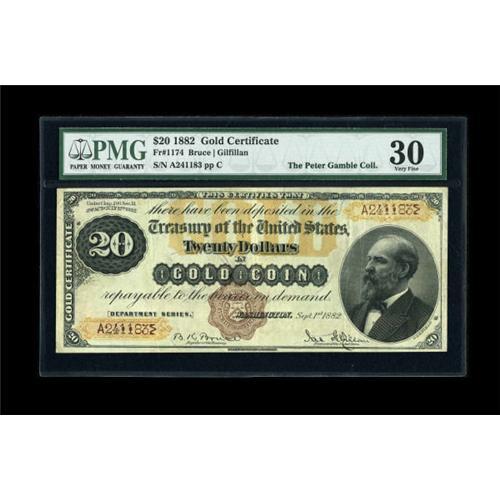 <B>Fr. 1174 $20 1882 Gold Certificate PMG Very Fine 30.</B></I> A rare number with only a few more than a dozen pieces reported in all grades combined. This PMG 30 piece is solidly in the top three or four best known examples of its number. It is beautifully bright, very well margined, and totally problem-free. The colors of the inks and paper are amazing for a VF note. The small brown scalloped seal is fully bright, and the brilliant gold back color shows not a trace of fading. Rare and very popular.<BR><I>From The Peter Gamble Collection.</B></I><BR><BR><b>Shipping:</b> Coins & Currency (<a target="_blank" href="http://www.heritageauctions.com/common/shipping.php">view shipping information</a>)