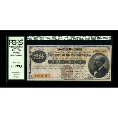 <B>Fr. 1175a $20 1882 Gold Certificate PCGS Very Fine 25PPQ.</B></I> Full margins, sound edges, and good color go hand-in-hand with this nice mid-grade note from one of the heralded issues in United States paper money. This is one of approximately 30 serial numbers reported in the census, with this much in demand variety having the engraved countersignature of Thomas C. Acton. Also, scrutiny reveals a natural note that has not been repaired, and is sure to bring a smile to the face of its next guardian.<BR><BR><b>Shipping:</b> Coins & Currency (<a target="_blank" href="http://www.heritageauctions.com/common/shipping.php">view shipping information</a>)